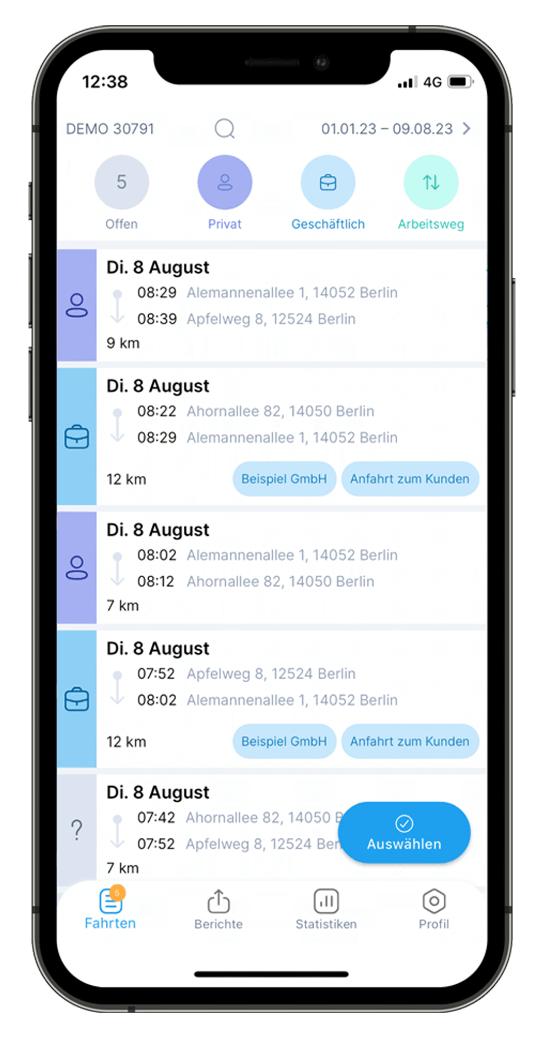 Teile deine Fahrten im elektronischen Fahrtenbuch beliebig auf und dokumentiere Umwege.
